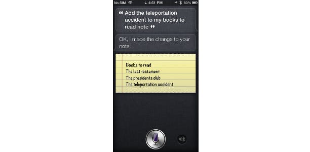 Zo zou ik bijvoorbeeld kunnen zeggen: “Maak een notitie met de naam Boeken die ik moet lezen.” Later, zelfs wanneer je niet met deze notitie aan het werk bent, kun je tegen Siri zeggen: “Voeg The Gift of Fear toe aan mijn notitie Boeken die ik moet lezen." Wanneer het tijd is om een nieuw e-book uit te zoeken, zeg ik: “Toon me mijn notitie Boeken die ik moet lezen” en klaar is Kees.