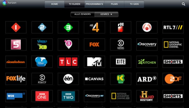 De Horizon.TV-app van UPC is handig in het gebruik en ziet er prima uit. Zowel de iPad- als iPhone-app is te bedienen in een overzichtelijk vormgegeven omgeving. Op de iPad-app kies je bovenaan met grote knoppen voor de verschillende onderdelen: Home, Tv kijken, Programma's, Films en Tv-gids. Live televisiekijken gebeurt vanzelfsprekend via de knop Tv kijken. Een overzicht met de logo's van de verschillende kanalen moet het makkelijker maken om meteen naar de juiste content te gaan.