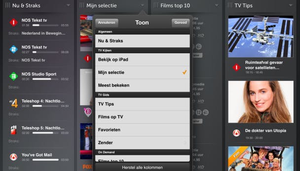 Erg handig is dat je in het hoofdmenu de inhoud van de kolommen zelf kunt indelen. Standaard is het scherm opgedeeld in een kolom Nu & Straks met de programmanaam, voortgangsbalk en tijden, Bekijk op iPad om meteen te kijken, Films Top 10 om een film tegen betaling te zien en TV Tips waarin de keuze van de redactie voor een leuk tv-avondje wordt uitgelicht.