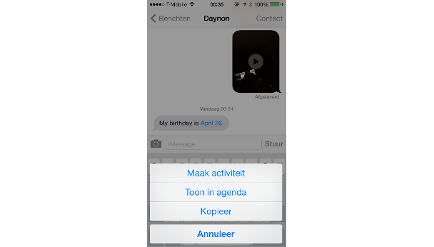 In iOS is de samenwerking tussen de diverse apps aanzienlijk vergroot. Een voorbeeld daarvan is de mogelijkheid om rechtstreeks vanuit iMessage een afspraak toe te voegen aan je Agenda. Wanneer iemand je een bericht stuurt met daarin een datum, dan kun je op deze datum drukken en vervolgens op Maak activiteit. De datum wordt automatisch toegevoegd aan je Agenda, alleen de details moet je uiteraard nog wel zelf verstrekken.