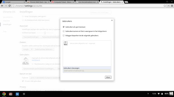 Gelukkig is het ook mogelijk om aan te geven wie er wel, of juist niet, gebruik mag maken van je Google-laptop. Zorg ervoor dat je als eigenaar bent ingelogd (het eerste account dat is aangemaakt) en klik op de statusbalk rechtsonder op de zwarte balk. In het menu dat verschijnt, klik je op Instellingen.