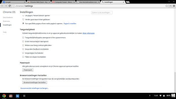 Je vindt de Powerwash-optie in het Instellingen-menu. Scrol naar de onderkant van de pagina, klik op Geavanceerde instellingen weergeven... en scrol wederom helemaal naar de onderkant van de pagina. Klik onder het kopje Powerwash op de knop Powerwash en vervolgens op Opnieuw opstarten. De Chromebook zal vervolgens worden teruggezet naar de fabrieksinstellingen en opnieuw worden opgestart.
