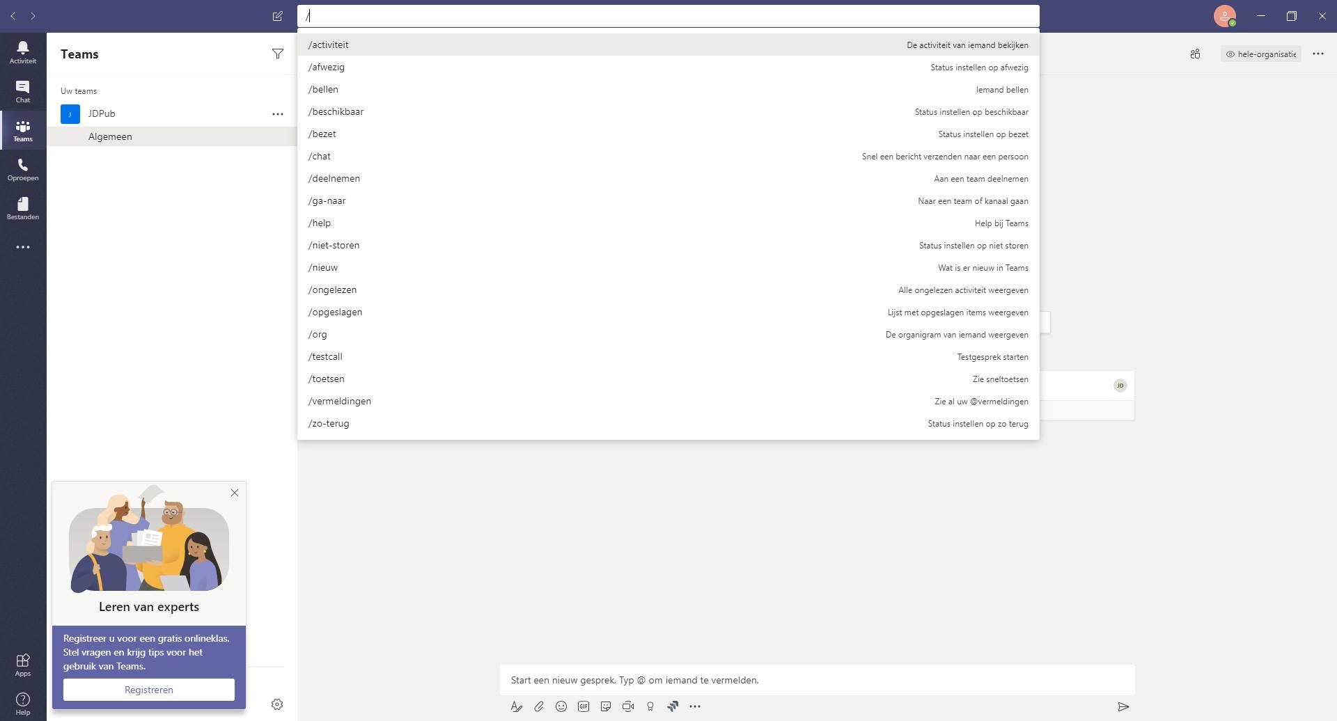 Het is wellicht niet direct duidelijk dat je de zoekbalk binnen Teams ook kunt gebruiken om opdrachten uit te voeren. Klik op de zoekbalk en druk op de /-toets op je toetsenbord om een overzicht te krijgen van de beschikbare opdrachten. Zo kun je in een handomdraai je status aanpassen en zien wat er nieuw is aan Teams of in welke berichten je allemaal bent vermeld. Met deze opdrachten kun je net even wat sneller werken, vooral als het gaat om taakjes die je vaak uitvoert.
