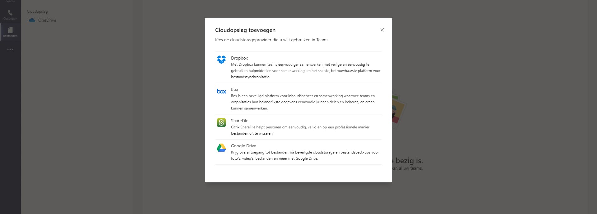 Gebruik je de gratis versie van Teams dan heb je standaard 10 GB aan gedeelde opslag en 2GB persoonlijke opslag in OneDrive. Maar wat als jij of je collega’s andere clouddiensten gebruiken? Dan kun je die gelukkig aan Teams koppelen door in de app op bestanden te drukken aan de linkerkant van de app en vervolgens op cloudopslag toevoegen. De meest populaire clouddiensten als Box, Dropbox en Google Drive worden door teams ondersteund.
