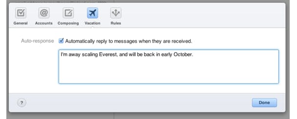 Dit is iets wat je niet in Mail op de Mac of op iOS kunt doen. Als je niet op je werk bent of op vakantie, wil je misschien een automatisch antwoord instellen zodat mensen weten wanneer je terug bent. Klik op het tandwiel-icoon rechts bovenaan de iCloud Mail pagina en klik op Preferences. Klik op het Vacation-icoon en vink Automatically reply to messages when they are received aan. Voer de tekst in die je wilt laten versturen en klik op Done.