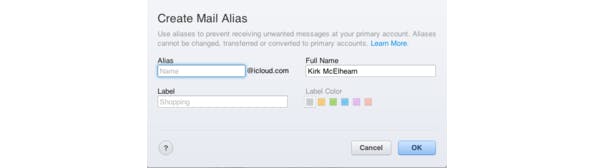 Hoewel je slechts één iCloud e-mail account hebt, kun je aliassen of andere adressen aanmaken die je kunt gebruiken om via die account e-mails te verzenden en te ontvangen. Klik in de iCloud e-mailvoorkeuren op Accounts > Add an alias. Je kunt maximaal drie aliassen kiezen. Het is handig om er eentje voor online winkelen aan te maken, eentje voor vrienden, en eentje voor je werk. Om spam op je belangrijkste adres te vermijden kun je bij het registreren een alias opgeven als e-mail adres.
