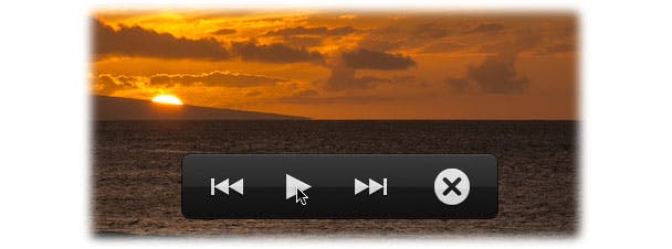 De slideshows van iPhoto bieden een grote controle over onder meer het thema (visuele animatiestijl), duur van de presentatie, muziek, overgangen, bijschriften en veel meer. Om te beginnen, selecteer een aantal foto's in iPhoto, of beter nog, selecteer een album omdat je dan de volgorde van de foto's kunt kiezen. Klik voor een directe slideshow op de Slideshow knop in de werkbalk van iPhoto, en kies in het paneel dat verschijnt een thema, muziek, enzovoorts. Klik op Play om de voorstelling te laten beginnen, en beweeg met de muis om een werkbalk op het scherm te laten verschijnen. In de Faces weergave kun je een directe slideshow beginnen door met Control-klik op een Faces album te klikken en Play Slideshow te kiezen in het snelkoppelingenmenu.