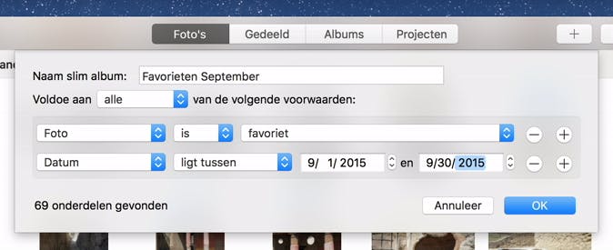Klik op de '+' rechtsboven en dan op Slim album om een slim album aan te maken. In het venster dat nu bovenin verschijnt, kun je allerlei criteria invoeren. Alle foto's die Foto's aan dit slimme album toevoegt, moeten aan deze criteria voldoen. Om een extra criteria toe te voegen druk je op de plus aan de rechterkant van het venstertje. Voer bijvoorbeeld in dat je alleen foto's wilt hebben die Favoriet zijn, en gemaakt zijn tussen 1 september en 1 oktober.