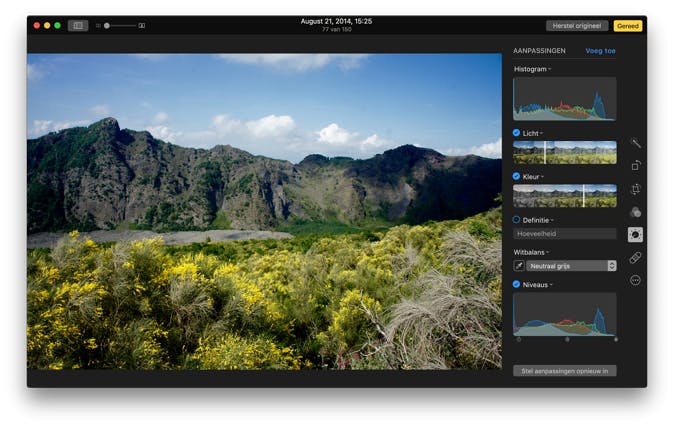 Pas aan laat je handmatig van alles instellen. Je kunt standaard de hoeveelheid licht en kleur aanpassen, en een zwart-wit foto creëren. Als je op Voeg toe klikt, kun je veel meer aanpassingen doen. Hier kun je kiezen voor Histogram, Scherper, Definitie, Ruisonderdrukking, Vignettering, Witbalans, en Niveaus. Door onder aan de lijst op Bewaar als standaard te klikken, sla je de huidige opties die je hebt toegevoegd in als standaard, zodat je altijd meteen beschikbaar zijn.