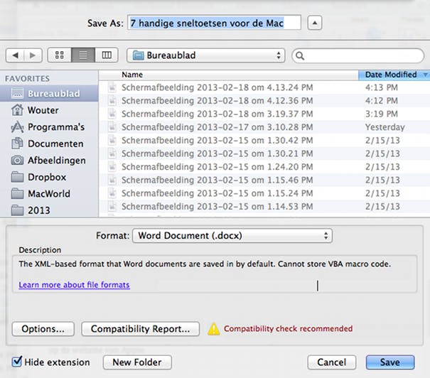Wil je een bestand opslaan? Dan kan je in nagenoeg alle apps op de Mac gebruik maken van de toetsencombinatie Command + S. Je krijgt vervolgens een scherm te zien waar je de locatie kunt aangeven waar het bestand moet worden opgeslagen.