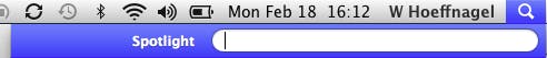 Spotlight kan razendsnel worden opgeroepen door de toetsencombinatie Command + Spatie te kiezen. OS X toont nu een blauwe zoekbalk waarin je direct je zoekopdracht kunt intikken.