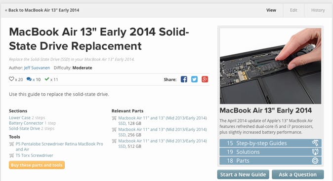 Op de website van iFixit vind je handleidingen en tips voor het installeren van een SSD in een MacBook Air.