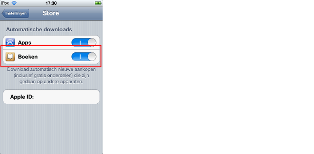 Boeken die al op uw Mac of pc staan, kunt u via iTunes overzetten naar uw iPhone, iPad of iPod touch. Komt u ergens op een website een leuk e-book tegen, dan kan het ook rechtstreeks vanuit de Safari-browser in iBooks worden geopend door op de link te tikken. U krijgt dan een venster te zien met de vraag waarmee u het bestand wilt openen. Kies hier voor Open met iBooks. Een e-book overzetten kan ook door het als bijlage in een e-mail naar het apparaat te sturen waarop u het wilt lezen, of door een dienst zoals Dropbox te gebruiken. Koopt u een e-book in de Store, dan kunt u dit automatisch op al uw andere Apple-apparaten ontvangen. U hoeft u het dan dus niet per apparaat zelf op te halen. Deze handige optie activeert u door op het hoofdscherm van een apparaat naar Instellingen te gaan en in de linkerkolom bij het onderdeel Store de optie Automatische downloads aan te zetten, die u voor Boeken ziet staan.