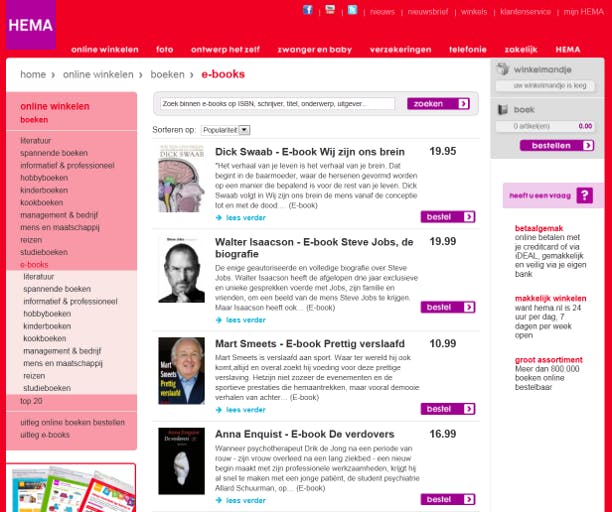Nederlandse boeken zijn via iBooks en natuurlijk ook met iTunes op een pc of Mac in ruime mate te vinden. Daarnaast kunt u bij diverse online boekwinkels in Nederland terecht, zoals Bol.com, Libris, Selexyz en sinds kort de Hema. Via de browser op een computer, maar ook met een tablet of smartphone, kunt u op de website winkelen en uw gekochte boeken daarna meteen binnenhalen. Overigens geldt ook daarbij de beperking dat boeken met Adobe DRM niet in iBooks zijn te gebruiken. In nagenoeg elke webwinkel zijn ook altijd wel een paar gratis boeken te vinden, kijk dus altijd even rustig rond.