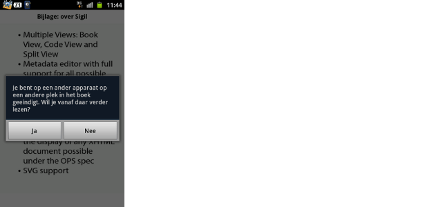 Om Boekenbol te gebruiken, meldt u zich - na installatie - in de app aan met uw Bol.com-gegevens. Zo maakt u bekend welke boeken u hebt gekocht. Daarna geeft u uw Adobe-gegevens in. Dat is nodig omdat u anders geen beveiligde boeken kunt openen. Registreren bij Adobe is gratis. Net als iBooks onthoudt Boekenbol waar u bent gebleven met lezen en zodoende kunt u meteen verder gaan, ook als u van apparaat wisselt. Een aardige bijzonderheid is dat u kunt wisselen tussen Apple- en Android-apparaten! Zodra u de app opstart en een boek opent, ziet u de melding dat er al op een ander apparaat in het boek is gelezen. U hebt dan de keuze om wel of niet naar dat punt toe te springen.