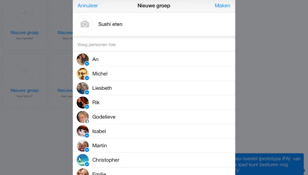 Een erg interessante functie van Facebook Messenger is de mogelijkheid om groepen aan te maken. Tik onderaan in de linkerkolom op Groepen en tik op het plusteken om een nieuwe groep aan te maken. Geef je groep een naam, bijvoorbeeld Sushi eten en kies vervolgens de namen van de mensen die je op het etentje wil uitnodigen. Tik op Maken en typ daarna je bericht in het hoofdvenster. Door links boven op de knop Vastzetten te tikken, kun je volgende keer nog sneller een bericht naar deze mensen versturen.