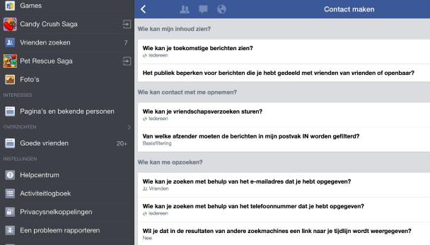 Wie een Facebook-account heeft, kan maar beter even stilstaan bij de privacy-instellingen. Keer terug naar de Facebook-app en tik linksboven op de knop met drie streepjes. Scrol in de donkergrijze kolom naar beneden en tik op Instellingen. Kies Privacy en kies bij Wie kan je toekomstige berichten zien? voor Vrienden. In dit venster kun je op eenzelfde manier instellen wie je vriendschapsberichten kan versturen of wie je profiel kan opzoeken.