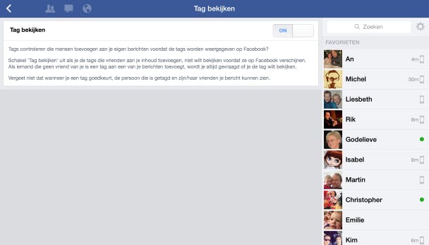 Taggen in Facebook is leuk, maar helaas zijn er ook heel wat mensen die deze functie misbruiken. Wil jij niet dat jij in een foto getagd kunt worden? Dan kun je dat heel eenvoudig uitschakelen. Ga net zoals in de vorige stap naar Instellingen en kies Tijdlijn en taggen. Hier krijg je te zien wie berichten op je tijdlijn kan plaatsen, wie kan taggen enzovoort. Tik op een item om het te wijzigen. Om frustraties te vermijden kun je onderaan Tag bekijken het beste inschakelen. Je kunt dan tags controleren die mensen toevoegen aan je eigen berichten, voordat die worden weergegeven op Facebook.