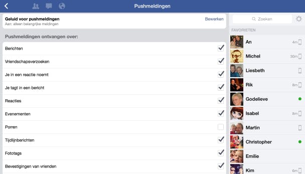 Soms is het vervelend om tientallen pushmeldingen te ontvangen. Gelukkig kun je via de Facebook-app zelf aangeven wanneer je een melding wilt krijgen. Ga naar Instellingen en kies Meldingen. Onder Pushmeldingen ontvangen over: krijg je een overzicht van de mogelijke gebeurtenissen. Vink hier gerust de dingen uit die je niet belangrijk vindt. Toepassingsverzoeken of Porren bijvoorbeeld. Via E-mailmeldingen beheren kun je selecteren voor welke gebeurtenissen je een e-mail wilt ontvangen.