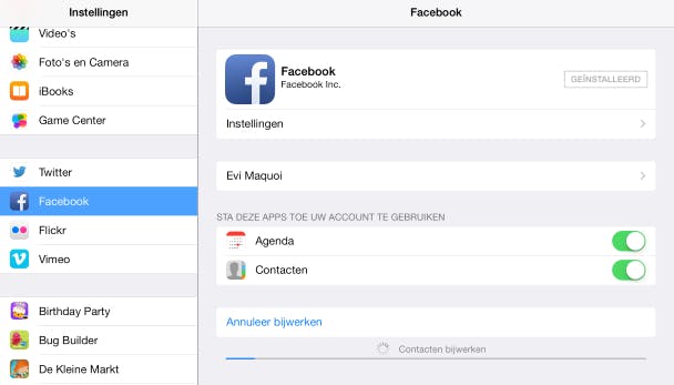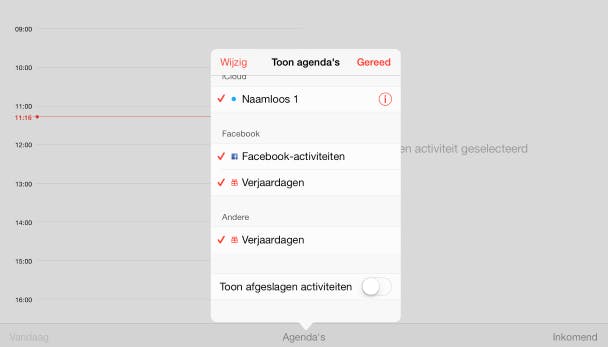 Een ander voordeel van de Facebook-integratie op je iPad is dat je de verjaardagen van je vrienden automatisch in je agenda kunt publiceren. Open Agenda en tik centraal onderaan op Agenda's om alle verschillende agenda's te kunnen bekijken. Helemaal onderaan vind je een hoofdstukje Facebook. Zet een vinkje voor Facebook-activiteiten om ze in je agenda op te nemen. Vink ook Verjaardagen aan zodat je niet kunt vergeten om iemand te feliciteren!