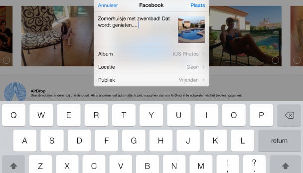 Een ander voordeel van de Facebook-integratie op je iPad is dat je berichten of foto's kunt publiceren zonder de Facebook-app te openen. Ga bijvoorbeeld naar de app Foto's en open je filmrol. Kies een foto, tik linksonder in beeld het deelpictogram (vierkantje en pijltje) en kies Facebook. Voer een bijschrift in en kies eventueel nog een album. Een locatie toevoegen kan eveneens. Bij Publiek kun je aangeven wie het bericht mag zien. Tik op Plaats om het bericht te publiceren.