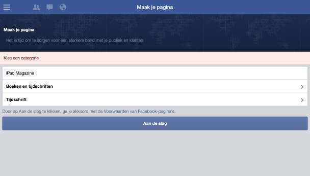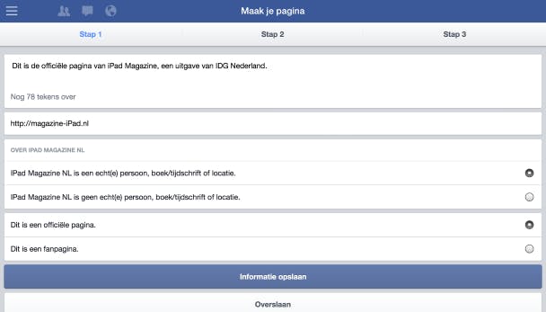 Als je Facebook-integratie (zie stap 9) hebt ingesteld, hoef je je zelfs niet aan te melden. Tik op Doorgaan om je automatisch in te loggen. De interface ziet er nagenoeg identiek uit aan die van Facebook. Veeg naar rechts of tik op de knop met de drie streepjes om de menubalk tevoorschijn te halen. Scrol naar beneden en tik op Pagina maken. Geef een naam op, bijvoorbeeld iPad Magazine NL, en geef ook nog even aan in welke categorie deze toekomstige Facebook-pagina thuishoort. Ga verder met Aan de slag.
