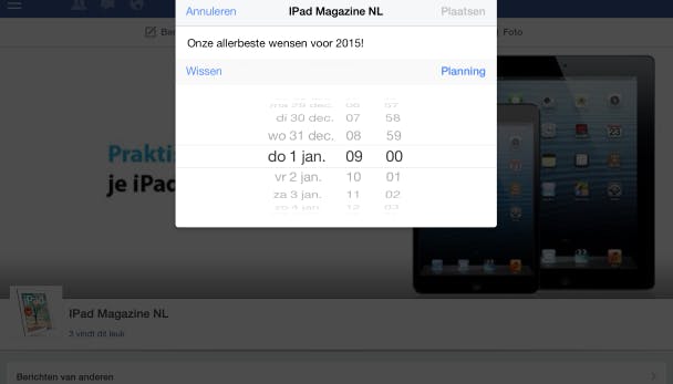 Het is voor bepaalde soorten content erg handig om deze op voorhand al in te plannen. Zo kun je nu al 'Onze beste wensen voor 2015' inplannen, zodat je het de dag zelf niet vergeet. Maak zoals in de vorige stap een nieuw bericht aan en tik op de knop met het klokje om een datum te kiezen. Geef naast de datum ook het exacte tijdstip op. Ga verder door op de knop Planning te tikken en voltooi met Plaatsen.