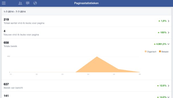 Zodra je 30 vind-ik-leuks hebt voor je pagina, kun je statistieken over je activiteiten opvragen. Op die manier leer je niet alleen je publiek kennen, maar kun je ook achterhalen welk soort bericht goed scoort bij je doelgroep. Kies Instellingen in de linkermarge en tik op Statistieken. Je kunt bij alle statistieken extra info opvragen door er één keer op te tikken. Er klapt dan een paneel met grafiekjes zodat je nog meer informatie over je pagina of een bepaald bericht kunt aflezen.