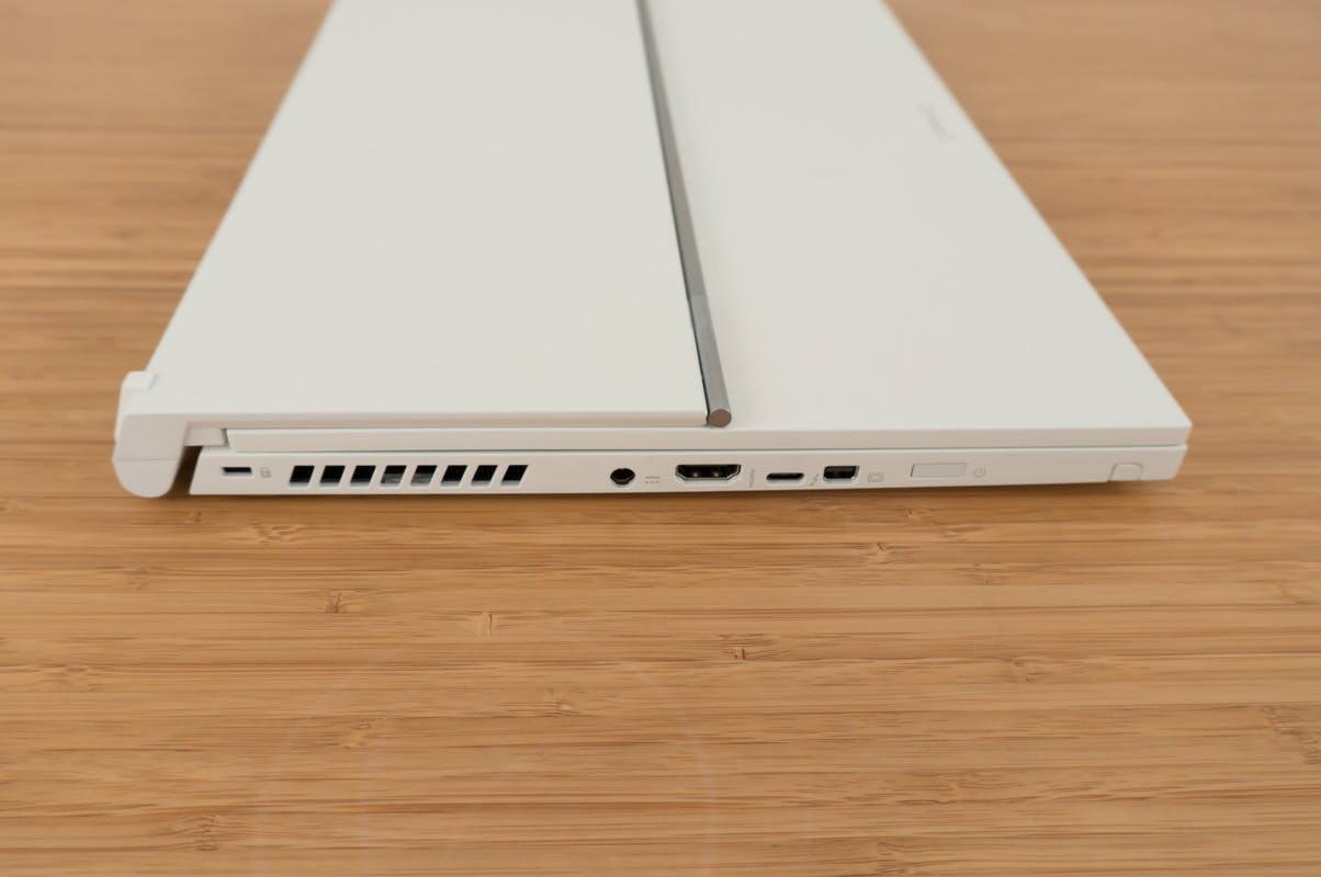 Ook opvallend: de laptop heeft twee aan/uit-schakelaars. Op het toetsenbord vind je er één in de rechterbovenhoek terwijl je ook op de rechterzijkant een powerknop vindt. Zo kun je de laptop ook aanzetten als het scherm uitgeklapt is. Die powertoets aan de zijkant is voorzien van een vingerafdrukscanner.