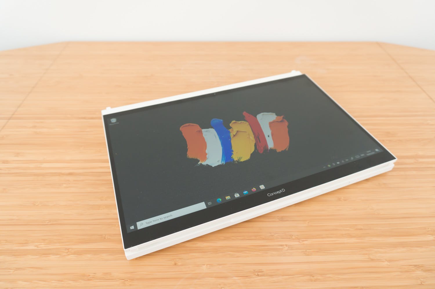 In de basis werkt de laptop als een normale laptop en kun je het scherm op de normale manier openklappen om op de laptop te werken. Door de extra scharnier kun je het scherm bovenop ook naar achter duwen waardoor je het scherm in een schuine stand zet. In combinatie met de normale schermscharnier kun je het scherm zo in iedere gewenste positie schuin naar je toe zetten en wordt de ConceptD een aanraak- of teken-pc. Het scherm kan ook helemaal omgedraaid worden waardoor de oorspronkelijke achterkant het scherm wordt. Door de laptop vervolgens dicht te klappen heb je een heel zware en dikke tablet. Wellicht handig als je op bijvoorbeeld de bank wilt schetsen.