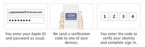 De beveiliging van Apple ID's bestaat voortaan uit twee stappen. Eerst log je in met behulp van een wachtwoord. Apple verstuurt vervolgens een code naar bijvoorbeeld je iPhone. Ook deze code moet je invoeren om toegang te krijgen tot je Apple ID en persoonlijke gegevens te kunnen wijzigen. De nieuwe werkwijze moet het aanzienlijk moeilijker maken zonder toestemming toegang te krijgen tot andermans Apple ID.