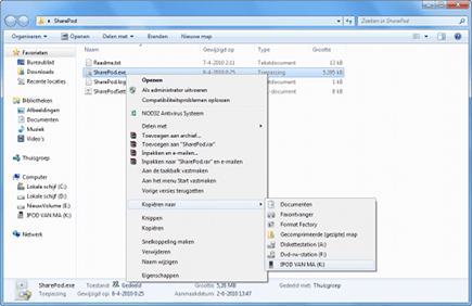 Met behulp van het programma SharePod hebt u volledige controle over uw iPod of iPhone, zonder dat het noodzakelijk is om software te installeren. Gemakkelijker kan dus bijna niet! U downloadt het programma vanaf de website Getsharepod. Pak vervolgens het zip-bestand van slechts 2 MB uit naar een willekeurige map. Als u het exe-bestand opstart, probeert de tool verbinding te maken met uw Apple-speler. Bij sommige types is het noodzakelijk dat Windows het apparaat als losse schijf herkent. De software geeft dat gelukkig zelf aan, zodat u deze functie met behulp van de handleiding kunt activeren. Zet het programma op de harde schijf van de iPod of iPhone, zodat u de inhoud simpel op meerdere computers beheert. U bent hierdoor dus niet meer afhankelijk van iTunes.
