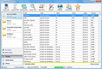 Met SharePod maakt u gemakkelijk nieuwe afspeellijsten. Navigeer hiervoor naar Playlists / New Playlist. Nadat u een naam hebt bedacht, verschijnt deze in het deelvenster aan de linkerkant. U voegt simpelweg audiotracks of video's toe door ze ernaartoe te slepen. Als u over een grote digitale muziekcollectie beschikt, dan is het handig om de zoekfunctie te gebruiken. Overigens is het ook mogelijk om bestaande afspeellijsten te bewerken of te verwijderen. Verder kunt u de tags van alle bestanden bewerken. Selecteer één of meerdere nummers en klik erop met de rechtermuisknop. Kies Properties en wijzig eventueel de gegevens. Via het tabblad Album Artwork voegt u een albumhoes toe. De software beschikt ook over een interne mediaspeler om audio af te spelen. Hierdoor draait u de muziek van uw draagbare mediaspeler gemakkelijk op elke computer. Tot slot is er een functie aanwezig om uw iPod of iPhone veilig van het systeem los te koppelen.