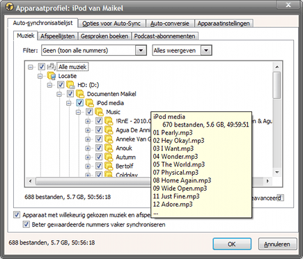 Het is mogelijk om uw Ipod of iPhone automatisch met de juiste data te synchroniseren. Navigeer naar Extra / Apparaat synchroniseren / Apparaat configureren. Geef vervolgens aan welke mappen er in aanmerking komen. U kunt voor het gemak ook de optie Alle muziek selecteren. Op de overige tabbladen synchroniseert u eventueel afspeellijsten, gesproken boeken en podcast-abonnementen. Handig is ook de optie om het apparaat met willekeurig gekozen nummers te vullen. Dat is vooral van toepassing bij draagbare spelers waarop niet de volledige bibliotheek past en u snel een muziekcollectie op zak wilt hebben. Hierbij geeft u desgewenst de audiotracks met een hoge waardering de voorkeur. In het tabblad Opties voor Auto-Sync geeft u aan dat de iPod automatisch moet synchroniseren zodra deze is aangesloten. Ook kunt u ervoor kiezen om bestanden te verwijderen van het apparaat die niet op de Auto-synclijst staan.