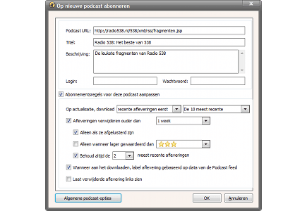 Met MediaMonkey abonneert u zich gemakkelijk op podcasts. Dat zijn audiobestanden die u van internet kunt downloaden met behulp van rss-feeds. Op deze manier worden bijvoorbeeld muziekprogramma's, interviews en radioshows verspreid. Ga in het programma naar Bewerken / Podcasts / Op nieuwe podcast abonneren. Voer achter Podcast URL de juiste weblink in. Als het goed is, verschijnt er automatisch een titel en een beschrijving in beeld. Indien nodig vult u een gebruikersnaam en wachtwoord in. Verder kunt u bepaalde instellingen wijzigen. Zo bepaalt u onder meer of oude afleveringen vanzelf worden verwijderd. Via de knop Algemene podcast-opties selecteert u de opslaglocatie op uw harde schijf en geeft u aan hoe vaak de software op nieuwe afleveringen moet controleren. U kunt de podcasts automatisch met uw draagbare mediaspeler synchroniseren.