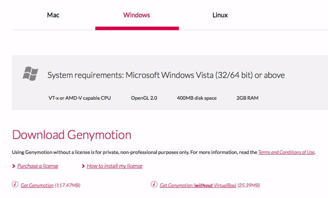Genymotion en VirtualBox werken als een tandem. De eerste levert voorverpakte Android-installaties die je op pc of Mac laat draaien. De tweede creëert de veilige, virtuele omgeving. Op de Windows-downloadpagina van dit product heb je de keuze tussen het pakket zonder of met VirtualBox. Ga voor de gecombineerde download van 117 MB en sla twee vliegen in één klap, je hebt beide programma's nodig.