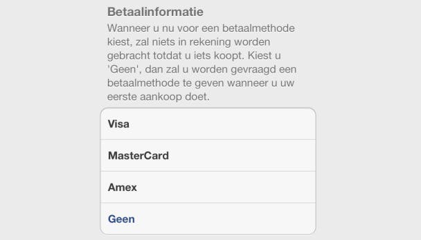 Apple hamert zo op deze veiligheidsmaatregelen omdat je je Apple ID ook gebruikt om apps, muziek, e-boeken en andere dingen aan te schaffen. Je zult dus ook je betaalinformatie moeten achterlaten tijdens de registratie. Hiervoor kun je alleen een creditcard gebruiken.