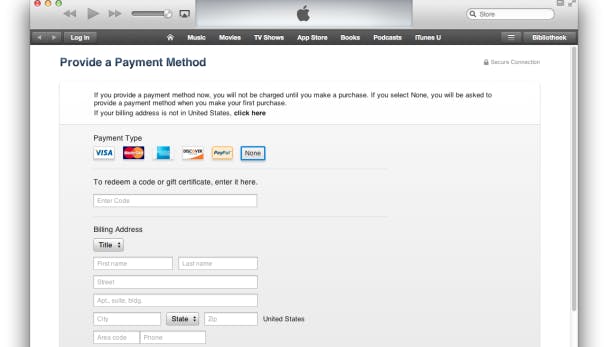 Een erg rare constructie, maar kennelijk wil Apple niet graag dat je geen betaalinformatie aan je Apple ID koppelt. Als je Apple ID eenmaal is gecreëerd, kun je het in de App Store gebruiken om apps te kopen, in de iTunes Store om muziek aan te schaffen en in de iBooks Store om e-boeken te lezen.