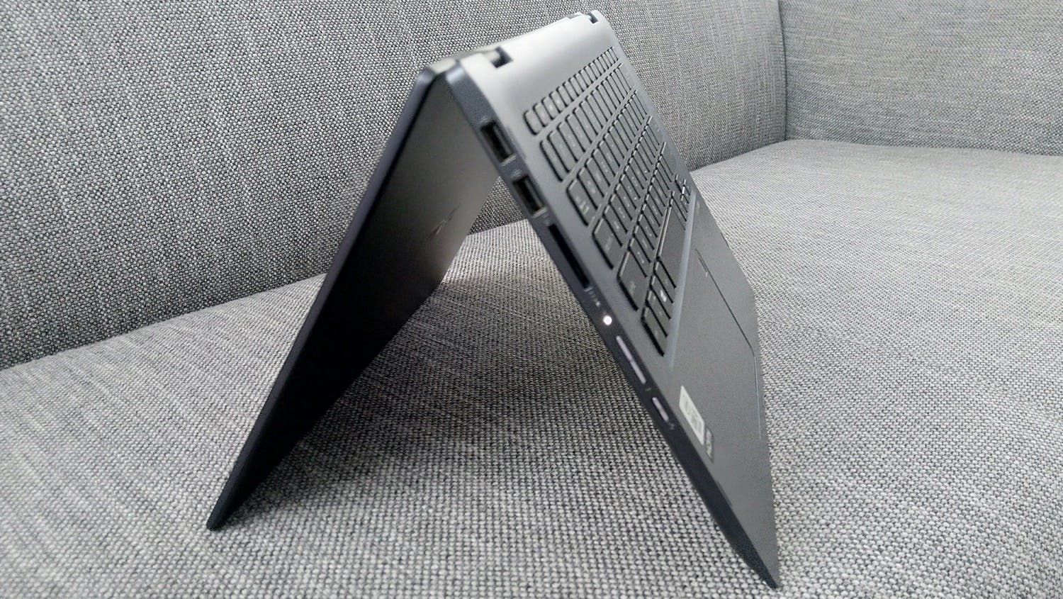 De term Flip in de productnaam, is niet voor niets. Het scherm is namelijk voorzien van een 360graden-scharnier waardoor je de laptop ook als tablet kunt gebruiken. Daarnaast kun je hem op verschillende manieren neerzetten, bijvoorbeeld met het toetsenbord naar onder en het scherm naar je toe. Je kunt hem ook als tentje neerzetten waarmee hij weinig oppervlakte in neemt, handig om een film in krappe omstandigheden te kijken. De scharnier biedt een prettige weerstand, waardoor je het scherm kunt aanraken zonder dat het scherm van positie verandert. Dat aanraken met de vinger werkt soepel en op de bank op schoot is de tabletfunctie een hanige toevoeging.