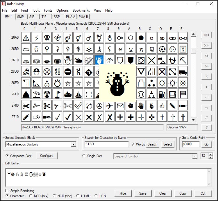 In het vak Select Unicode Block blader je door de verschillende schriften. Wil je Transport and Map Symbols, Emoticons, Hebreeuws of Egyptische hiërogliefen? De karakters die je hier vindt, kun je naar het klembord exporteren om ze vandaar over te brengen naar je eigen tekst. De tool kan zelfs decimale of hexadecimale karaktercodes exporteren, zodat je ze kunt gebruiken in xml- of html-documenten.