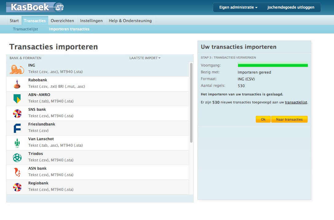 Sommige huishoudboekjes kunnen je transacties automatisch vanuit internetbankieren importeren. Helaas is dat niet het geval bij Kasboek.nl en BankTrans. Voor Kasboek.nl doe je dat door te gaan naar Transacties en dan naar Importeren transacties. Daar kun je kiezen vanaf welke bank je de transacties wilt importeren. Deze moet je echter eerst zelf exporteren vanaf je bank. Daarvoor ga je voor ING naar je internetbankieromgeving, waar je onderaan bij Overzichten de optie Af- en bijschrijvingen downloaden vindt.