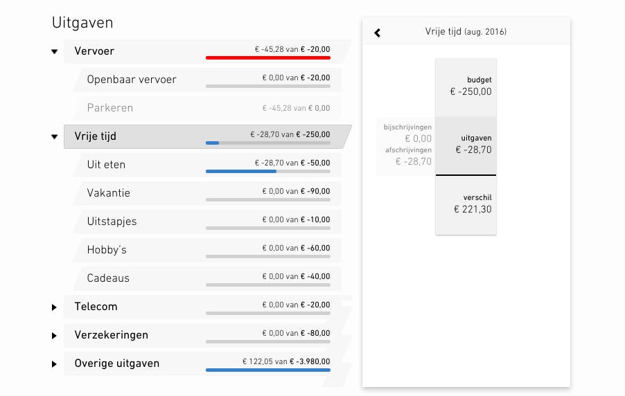 De mogelijkheden van die wijzer zijn echter vrij beperkt. Bij de Rabobank is al wat meer mogelijk, namelijk door middel van widgets. Widgets zijn kleine stukjes informatie over je financiële situatie. Zo is er bijvoorbeeld een cirkeldiagram waarin je in één oogopslag kunt zien welke typen uitgaven je per maand doet. Handig is dat de Rabo automatisch je uitgaven in een categorie indeelt. Nóg beter bezig is ABN, dat een app genaamd Grip heeft uitgebracht. Deze kun je koppelen aan je spaar- en betaalrekening en geeft je duidelijk inzicht in je uitgaven en inkomsten door middel van een tijdlijn. Ook kun je zelf budgetten instellen en pushnotificaties ontvangen, bijvoorbeeld bij een grote uitgave of als je budget op is. Helaas is de app op het moment van schrijven nog in gesloten bèta en is het onduidelijk wanneer de ABN ‘m openstelt voor iedereen.