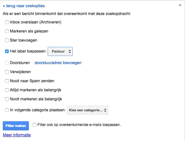 Vink de optie aan Het label toepassen en klik op Label kiezen / Nieuw label. Geef het label een naam en klik op Maken. Nu worden je facturen automatisch ingedeeld in een overzichtelijk mapje. Met IFTTT is het dan nog mogelijk om automatisch je facturen te exporteren en op te slaan naar bijvoorbeeld Dropbox. Daarvoor is dit recept handig. Voor Outlook maak je eerst een nieuwe categorie aan door te klikken op Nieuwe categorie links. Typ een naam voor je categorie. Ga daarna rechtsboven naar het tandwiel en klik op Regels beheren / Nieuw. Maak nu een nieuwe regel aan, door links de voorwaarde in te stellen en rechts het net aangemaakte label erop toe te passen.