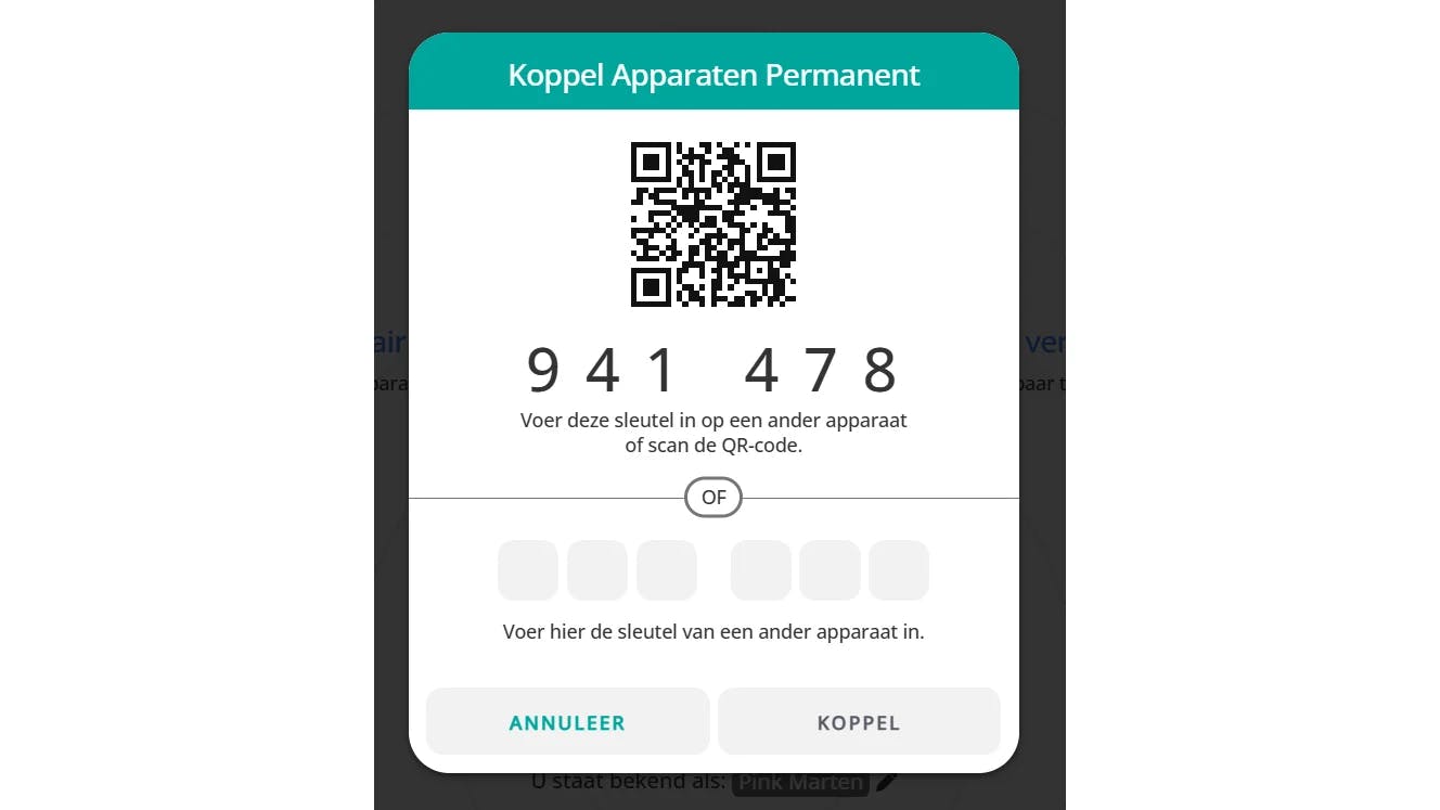 Deel je regelmatig bestanden tussen dezelfde apparaten, dan kun je ook een permanente koppeling instellen. Wanneer de toestellen gekoppeld zijn, kun je bestanden delen via het internet. Dat werkt zelfs wanneer beide toestellen niet op hetzelfde netwerk zijn aangesloten. In deze modus is het zelfs mogelijk om tekst naar het andere apparaat te sturen. Dat is vooral handig als je snel links wilt delen. Om de permanente koppeling tot stand te laten komen, voer je de zes cijfers van de sleutel in op het andere apparaat of scan je de QR-code.