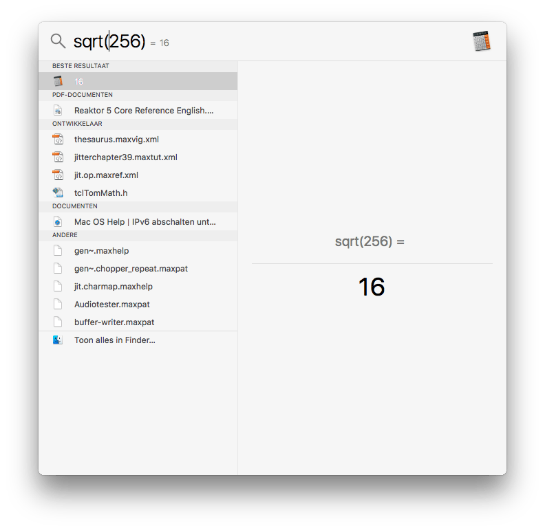 Moeilijkere bewerkingen werken overigens ook. Probeer maar eens de wortel van 256 te trekken door sqrt(256) in te typen. Een machtsverheffing doe je met het symbool ^, het antwoord van 4^3 (oftewel 4³) is 64.