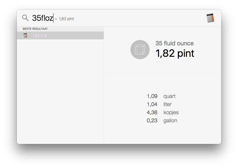 Wil je weten hoeveel meter een yard is of hoeveel fluid ounce er in een liter past, dan typ je dit gewoon in het zoekveld en Spotlight geeft je aan de rechterkant een paar omrekenopties. Gek genoeg kent Spotlight alleen Nederlandse vertalingen en dit is af en toe een beetje vreemd: Cups kent Spotlight niet, Kopjes wel.