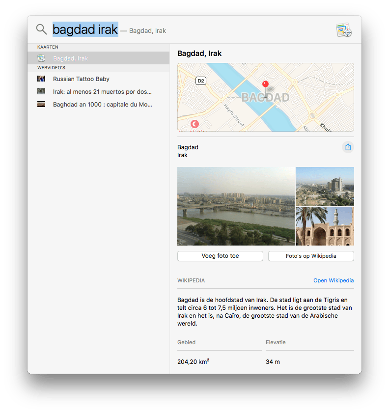 Locaties vind je door de naam plus het land in te typen. Bagdad, Irak geeft je meteen een kaart van Irak en eronder vind je foto's en informatie van Wikipedia. Uiteraard klik je meteen op de kaart om naar de Kaarten-app op je Mac te gaan.