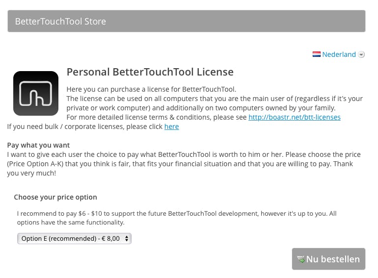 BetterTouchTool was ooit gratis, maar tegenwoordig moet je er geld voor betalen. Je mag zelf bepalen hoeveel je uit wilt geven, het minimum is 4,49 euro. Een proefversie van 45 dagen download je gratis vanaf www.boastr.net.
