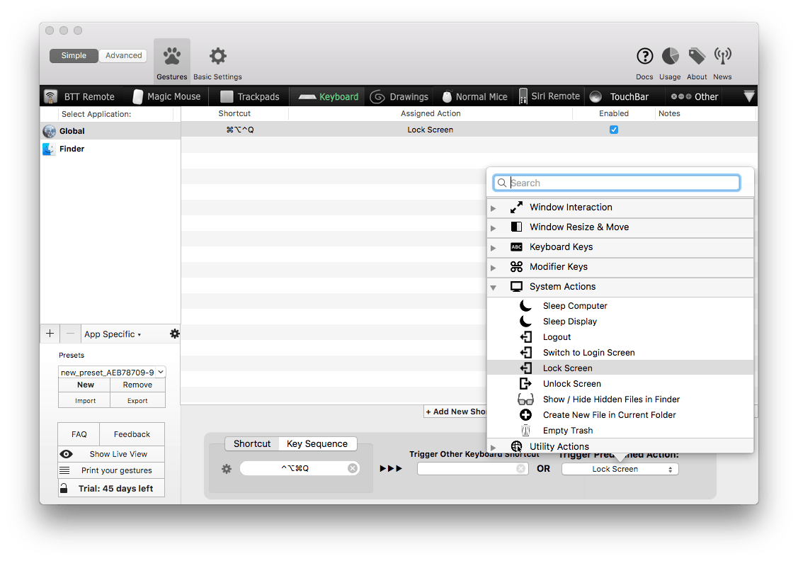 Nu kun je bij Trigger Predefined Action een actie kiezen. Dit kan bijvoorbeeld een actie in macOS zijn zoals je scherm vergrendelen. Deze actie vind je onder System Actions / Lock Screen.