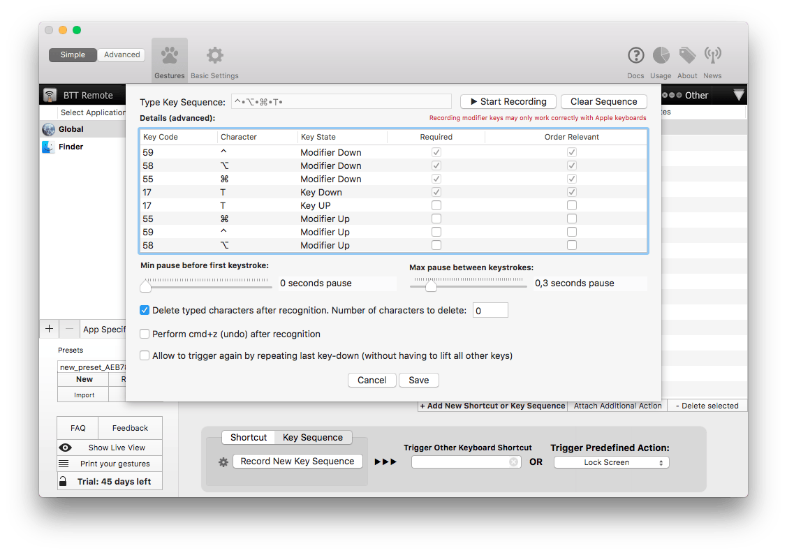 Je kunt ook een sequens aangeven. Op deze manier wordt een actie alleen uitgevoerd als je bepaalde toetsen achter elkaar intoetst. Kies voor Key Sequence, klik op Record New Key Sequence en kies voor Start Recording. Voer de toetsen achterelkaar in en stop de opname door op Stop Recording te klikken.